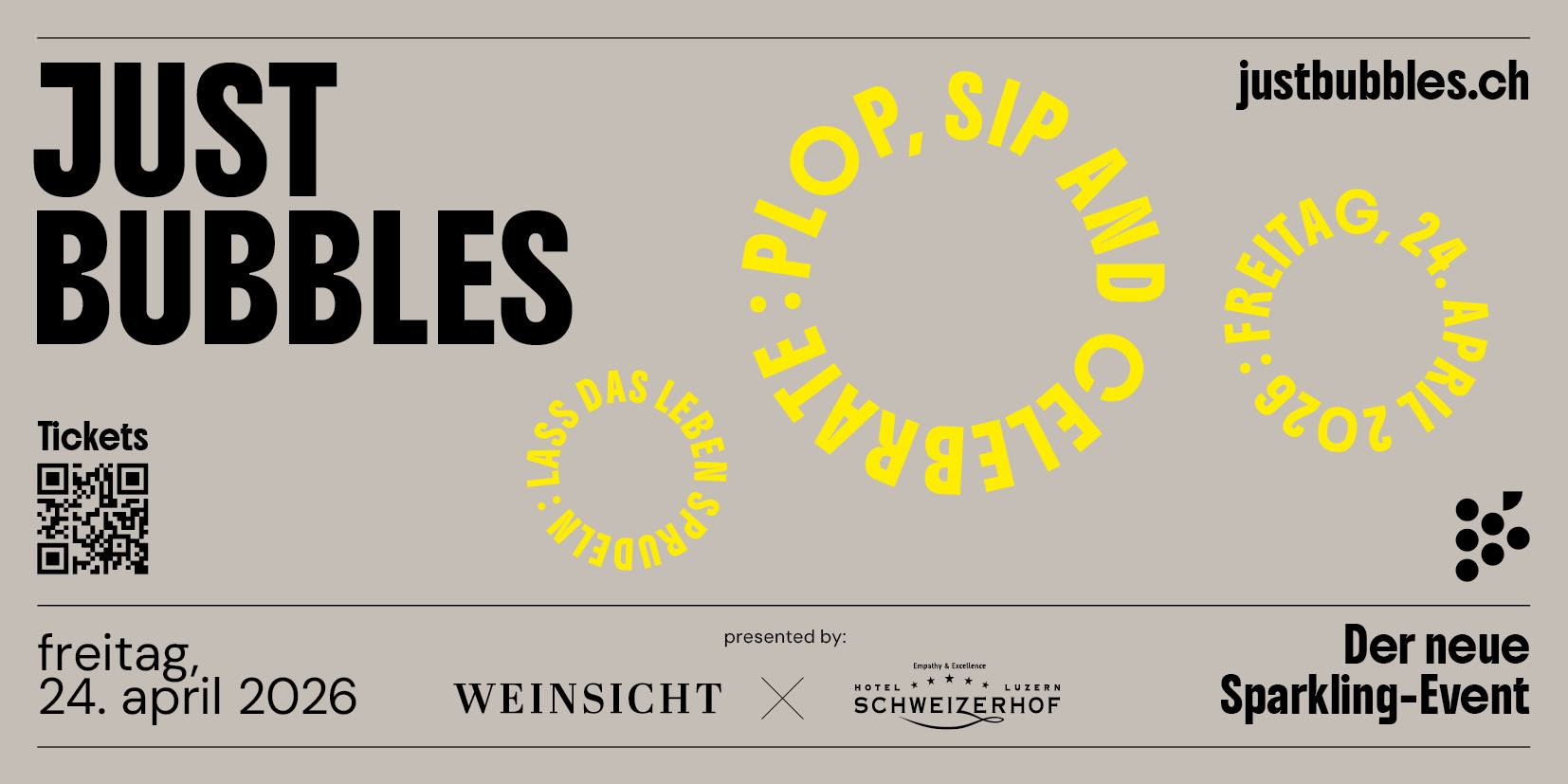 Präsentiert wird JUST BUBBLES von Weinsicht und dem Hotel Schweizerhof Luzern. Unterstützt wird der Anlass zudem von mehreren Eventpartnern.